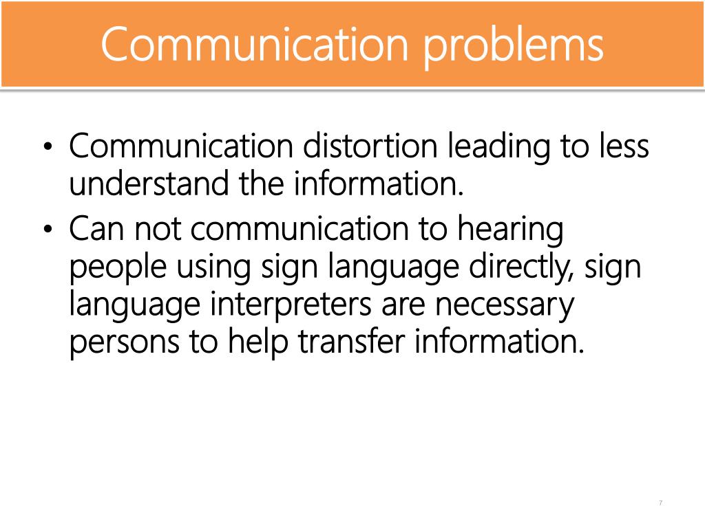 Communication problems • Communication distortion leading to less understand the information. • Can not communication to hearing people using sign language directly, sign language interpreters are necessary persons to help transfer information.