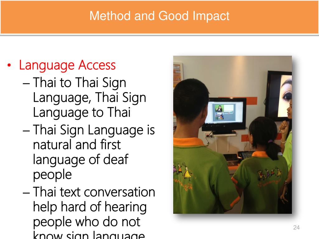 Method and Good Impact • Language Access • Thai to Thai Sign Language, Thai Sign Language to Thai • Thai Sign Language is natural and first language of deaf people • Thai text conversation help hard of hearing people who do not know sign language
