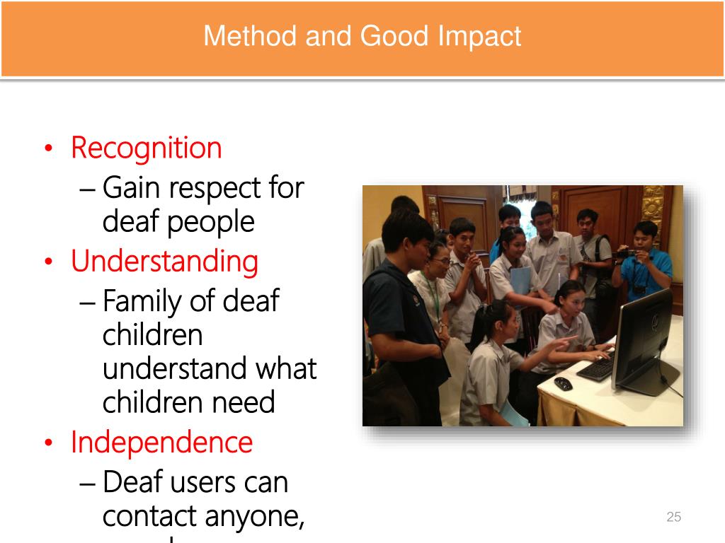 Method and Good Impact • Recognition • Gain respect for deaf people • Understanding • Family of deaf children understand what children need • Independence • Deaf users can contact anyone, anywhere