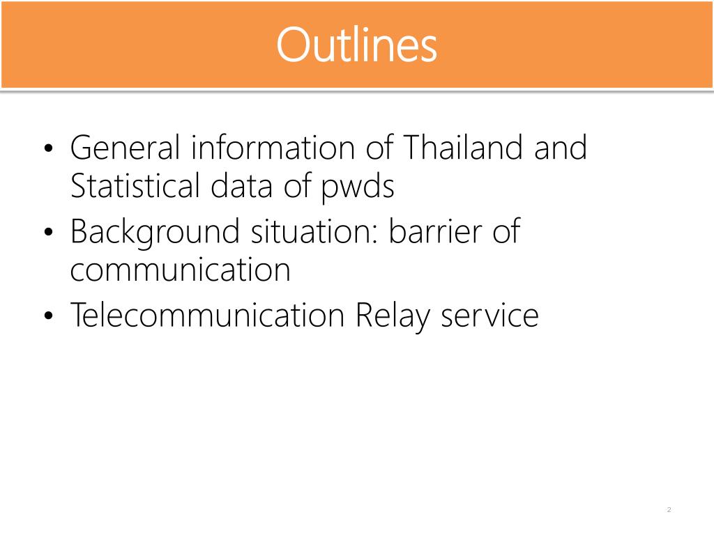 Outlines • General information of Thailand and Statistical data of pwds • Background situation: barrier of communication • Telecommunication Relay service