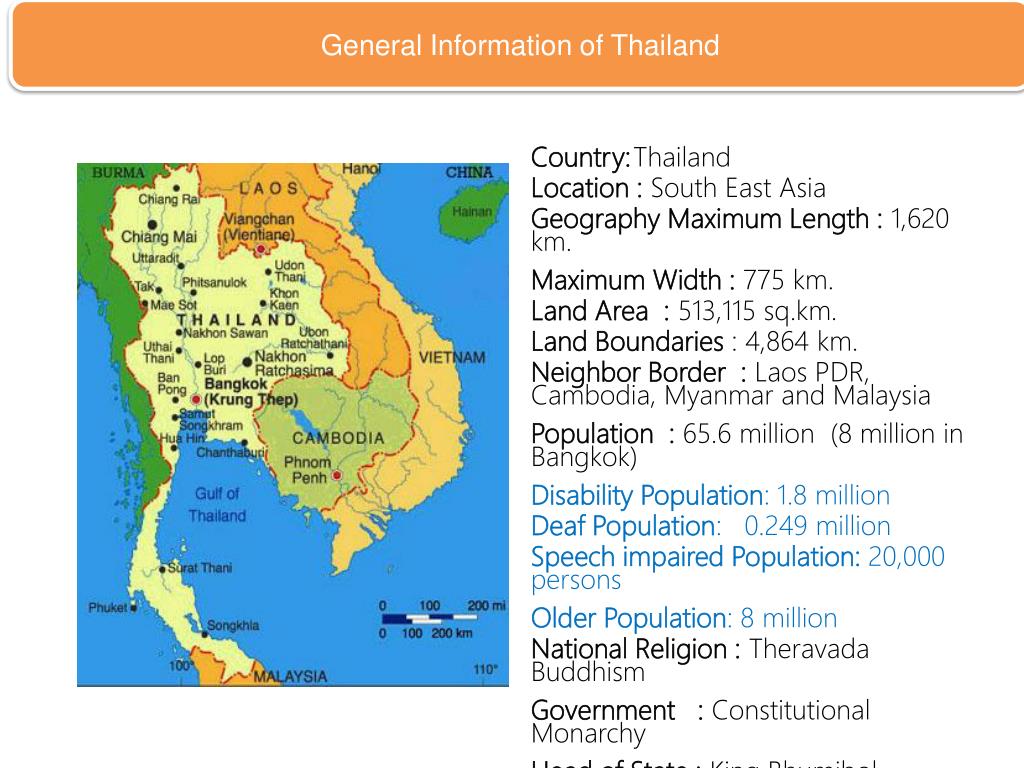 General Information of Thailand Country: Thailand Location : South East Asia Geography Maximum Length : 1,620 km. Maximum Width : 775 km. Land Area : 513,115 sq.km. Land Boundaries : 4,864 km. Neighbor Border : Laos PDR, Cambodia, Myanmar and Malaysia Population : 65.6 million (8 million in Bangkok) Disability Population: 1.8 million Deaf Population: 0.249 million Speech impaired Population: 20,000 persons Older Population: 8 million National Religion : Theravada Buddhism Government : Constitutional Monarchy Head of State : King BhumibolAdulyadej Head of Government : Prime MinisterYingluckShinawat Currency : Bath (THB)