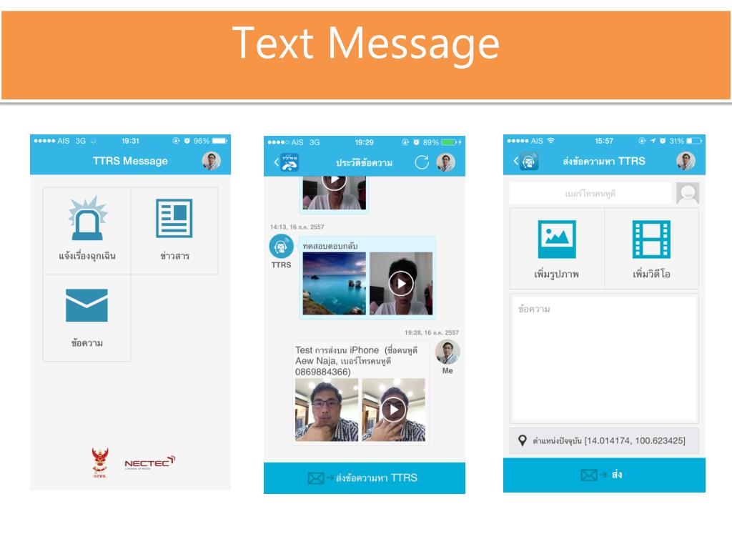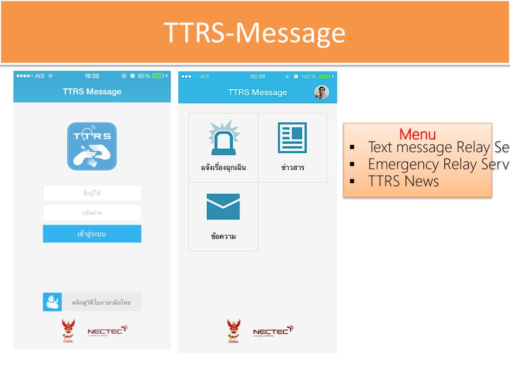 THAI TELECOMMUNICATION RELAY SERVICE SMS, MMS สนทนาข้อความ สนทนาวิดีโอ สนทนาวิดีโอผ่านอุปกรณ์สื่อสารเคลื่อนที่ สนทนาวิดีโอผ่านตู้ TTRS ฉุกเฉิน