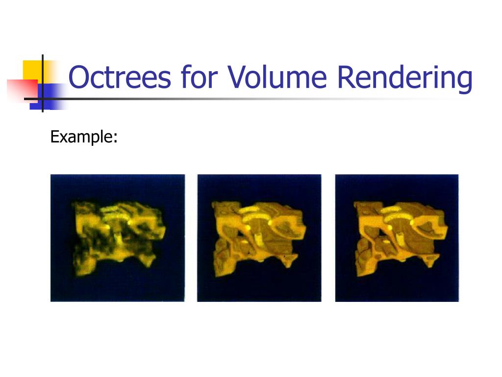 Octrees for Volume Rendering • Each tree node stores the mean value of the encompassed voxels • Alternatively, each tree node stores a subvolume of reduced resolution • Each tree node also stores an error measure: e.g. standard deviation of the voxels (root mean square to the approximated value)