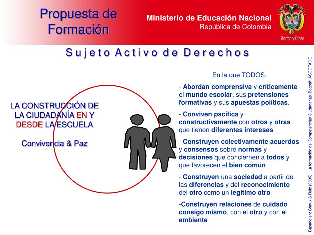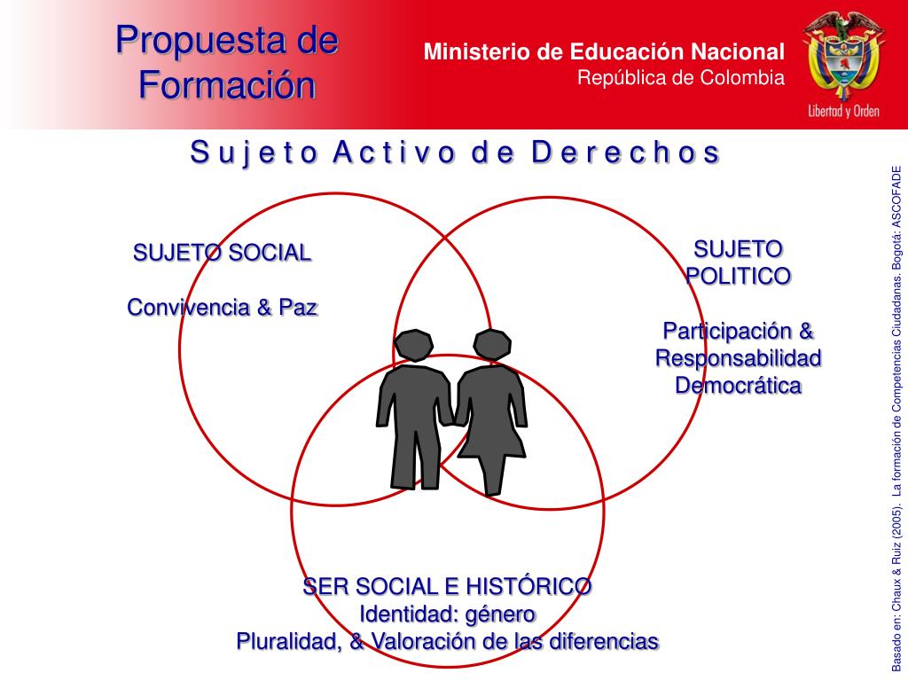 SUJETO POLITICO Participación & Responsabilidad Democrática SUJETO SOCIAL Convivencia & Paz SER SOCIAL E HISTÓRICO Identidad: género Pluralidad, & Valoración de las diferencias Propuesta de Formación S u j e t o A c t i v o d e D e r e c h o s Basado en: Chaux & Ruiz (2005). La formación de Competencias Ciudadanas. Bogotá: ASCOFADE