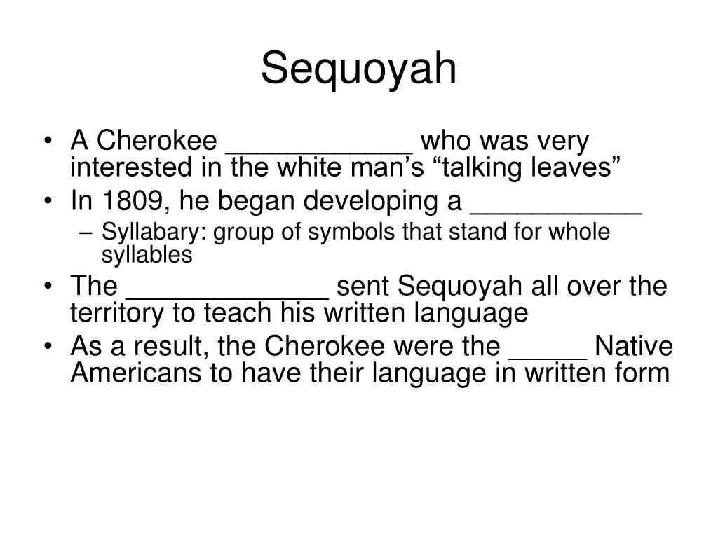 Sequoyah • A Cherokee ____________ who was very interested in the white man’s “talking leaves” • In 1809, he began developing a ___________ • Syllabary: group of symbols that stand for whole syllables • The _____________ sent Sequoyah all over the territory to teach his written language • As a result, the Cherokee were the _____ Native Americans to have their language in written form