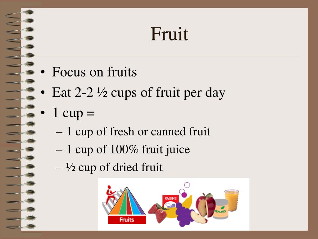 Fruit • Focus on fruits • Eat 2-2 ½ cups of fruit per day • 1 cup = • 1 cup of fresh or canned fruit • 1 cup of 100% fruit juice • ½ cup of dried fruit