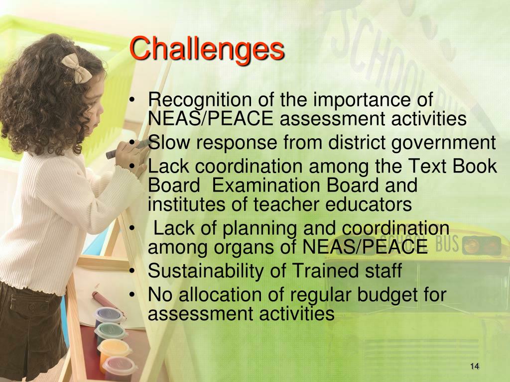 Challenges Recognition of the importance of NEAS/PEACE assessment activities Slow response from district government Lack coordination among the Text Book Board Examination Board and institutes of teacher educators Lack of planning and coordination among organs of NEAS/PEACE Sustainability of Trained staff No allocation of regular budget for assessment activities