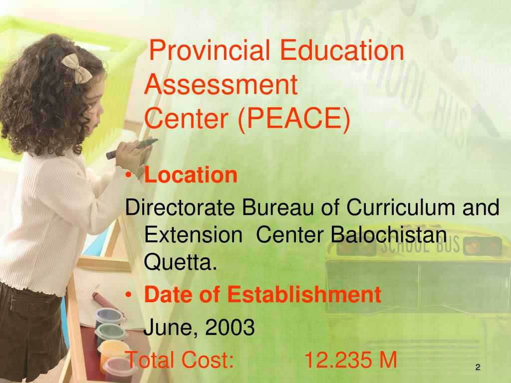 PROVINCIAL EDUCATION ASSESSMENT CENTRE(PEACE). Bureau of Curriculum and Extension & Extension Centre Quetta. Provincial Education Assessment Center (PEACE) Location Directorate Bureau of Curriculum and Extension Center Balochistan Quetta. Date of Establishment June, 2003