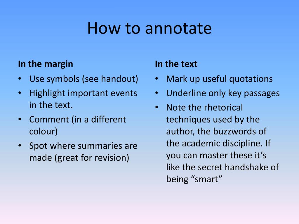 How to annotate In the margin In the text Mark up useful quotations Underline only key passages Note the rhetorical techniques used by the author, the buzzwords of the academic discipline. If you can master these it’s like the secret handshake of being “smart” • Use symbols (see handout) • Highlight important events in the text. • Comment (in a different colour) • Spot where summaries are made (great for revision)