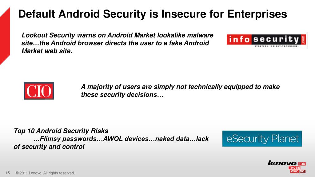 Default Android Security is Insecure for Enterprises Lookout Security warns on Android Market lookalike malware site…the Android browser directs the user to a fake Android Market web site. A majority of users are simply not technically equipped to make these security decisions… Top 10 Android Security Risks …Flimsy passwords…AWOL devices…naked data…lack of security and control