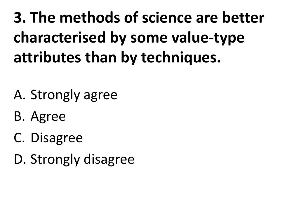 3. The methods of science are better characterised by some value-type attributes than by techniques. • Strongly agree • Agree • Disagree • Strongly disagree