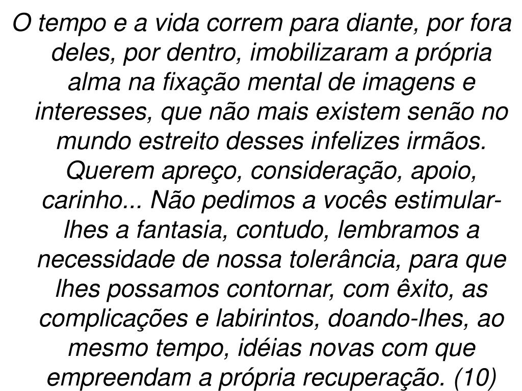O tempo e a vida correm para diante, por fora deles, por dentro, imobilizaram a própria alma na fixação mental de imagens e interesses, que não mais existem senão no mundo estreito desses infelizes irmãos. Querem apreço, consideração, apoio, carinho... Não pedimos a vocês estimular-lhes a fantasia, contudo, lembramos a necessidade de nossa tolerância, para que lhes possamos contornar, com êxito, as complicações e labirintos, doando-lhes, ao mesmo tempo, idéias novas com que empreendam a própria recuperação. (10)