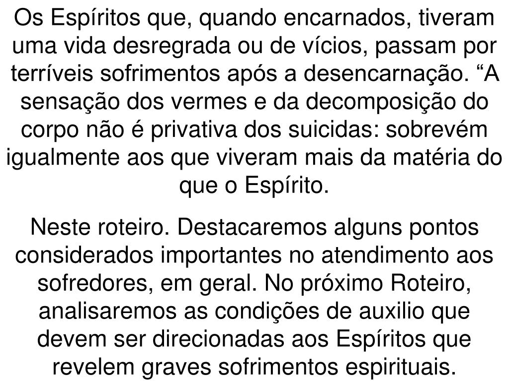 Os Espíritos que, quando encarnados, tiveram uma vida desregrada ou de vícios, passam por terríveis sofrimentos após a desencarnação. “A sensação dos vermes e da decomposição do corpo não é privativa dos suicidas: sobrevém igualmente aos que viveram mais da matéria do que o Espírito. Neste roteiro. Destacaremos alguns pontos considerados importantes no atendimento aos sofredores, em geral. No próximo Roteiro, analisaremos as condições de auxilio que devem ser direcionadas aos Espíritos que revelem graves sofrimentos espirituais.