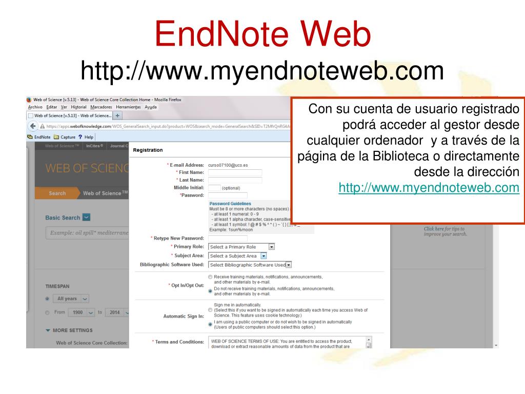 EndNote WebPágina de inicio El primer paso es registrarse a través de la página de la Biblioteca, desde la sección Bases de Datos, seleccione WOS y Regístrese Una vez que tenga la cuenta de usuario podrá acceder desde cualquier ordenador conectado a internet, desde la dirección: http://www.myendnoteweb.com