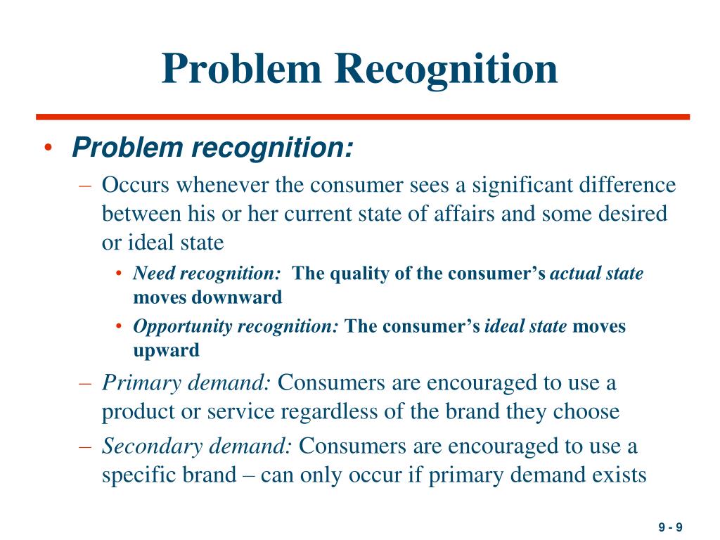 Problem Recognition • Problem recognition: • Occurs whenever the consumer sees a significant difference between his or her current state of affairs and some desired or ideal state • Need recognition: The quality of the consumer’s actual state moves downward • Opportunity recognition: The consumer’s ideal state moves upward • Primary demand: Consumers are encouraged to use a product or service regardless of the brand they choose • Secondary demand: Consumers are encouraged to use a specific brand – can only occur if primary demand exists