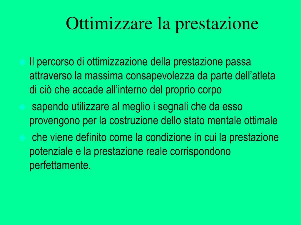 Ottimizzare la prestazione • Il percorso di ottimizzazione della prestazione passa attraverso la massima consapevolezza da parte dell’atleta di ciò che accade all’interno del proprio corpo • sapendo utilizzare al meglio i segnali che da esso provengono per la costruzione dello stato mentale ottimale • che viene definito come la condizione in cui la prestazione potenziale e la prestazione reale corrispondono perfettamente.