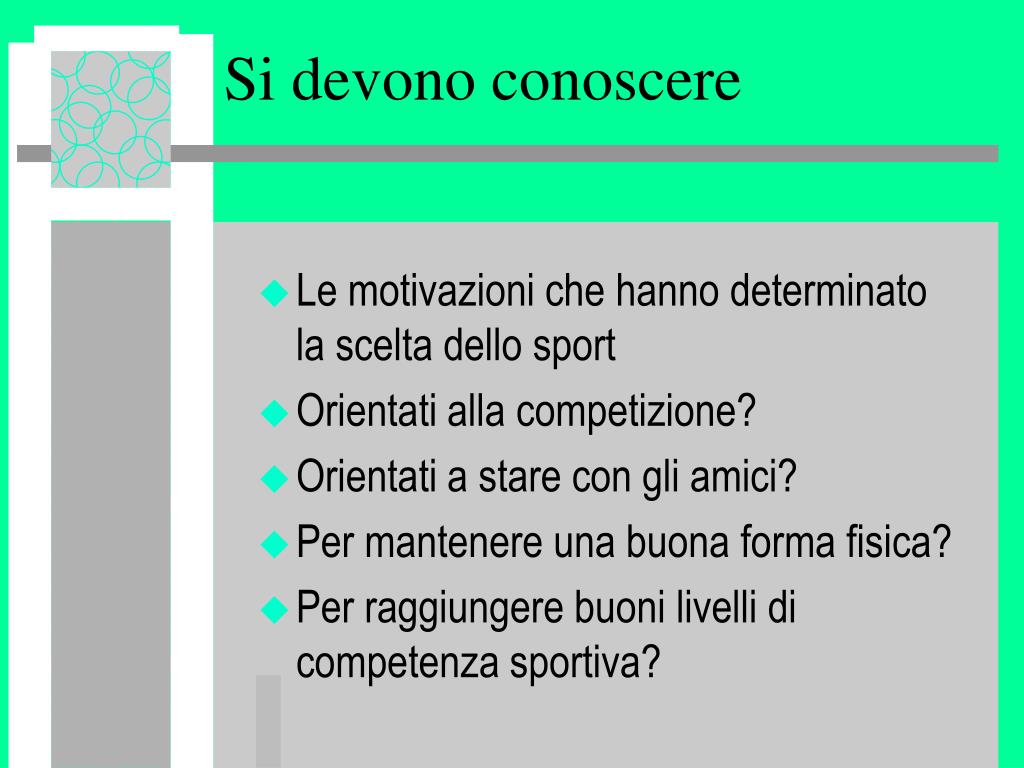 Si devono conoscere • Le motivazioni che hanno determinato la scelta dello sport • Orientati alla competizione? • Orientati a stare con gli amici? • Per mantenere una buona forma fisica? • Per raggiungere buoni livelli di competenza sportiva?