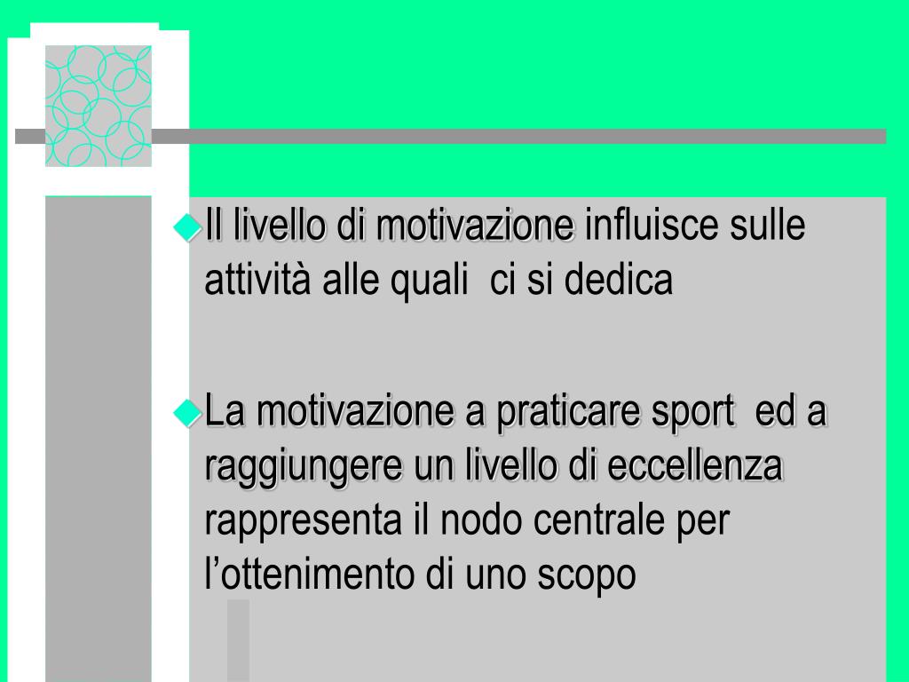 Il livello di motivazione influisce sulle attività alle quali ci si dedica • La motivazione a praticare sport ed a raggiungere un livello di eccellenza rappresenta il nodo centrale per l’ottenimento di uno scopo