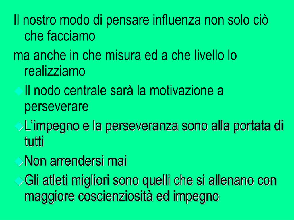 Il nostro modo di pensare influenza non solo ciò che facciamo ma anche in che misura ed a che livello lo realizziamo • Il nodo centrale sarà la motivazione a perseverare • L’impegno e la perseveranza sono alla portata di tutti • Non arrendersi mai • Gli atleti migliori sono quelli che si allenano con maggiore coscienziosità ed impegno