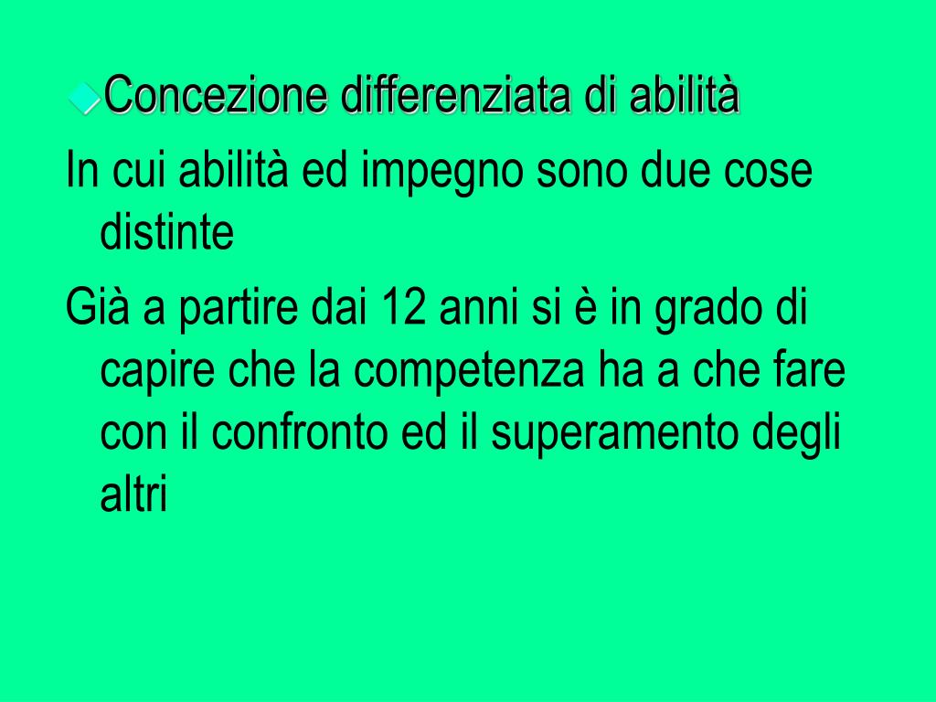 Concezione differenziata di abilità In cui abilità ed impegno sono due cose distinte Già a partire dai 12 anni si è in grado di capire che la competenza ha a che fare con il confronto ed il superamento degli altri