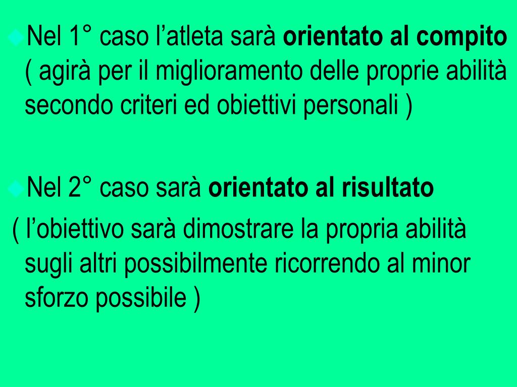 Nel 1° caso l’atleta sarà orientato al compito ( agirà per il miglioramento delle proprie abilità secondo criteri ed obiettivi personali ) • Nel 2° caso sarà orientato al risultato ( l’obiettivo sarà dimostrare la propria abilità sugli altri possibilmente ricorrendo al minor sforzo possibile )