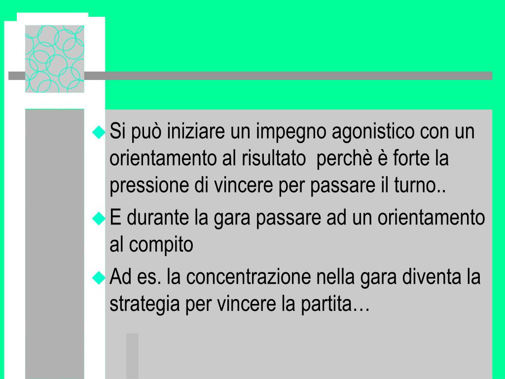 Si può iniziare un impegno agonistico con un orientamento al risultato perchè è forte la pressione di vincere per passare il turno.. • E durante la gara passare ad un orientamento al compito • Ad es. la concentrazione nella gara diventa la strategia per vincere la partita…