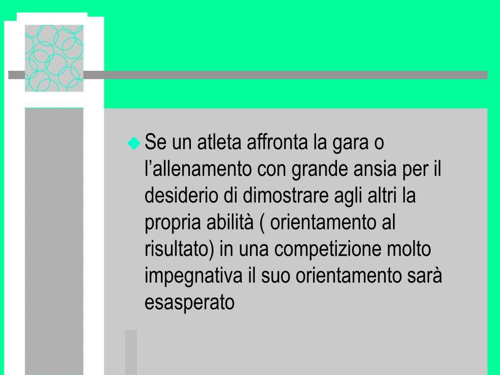 Se un atleta affronta la gara o l’allenamento con grande ansia per il desiderio di dimostrare agli altri la propria abilità ( orientamento al risultato) in una competizione molto impegnativa il suo orientamento sarà esasperato