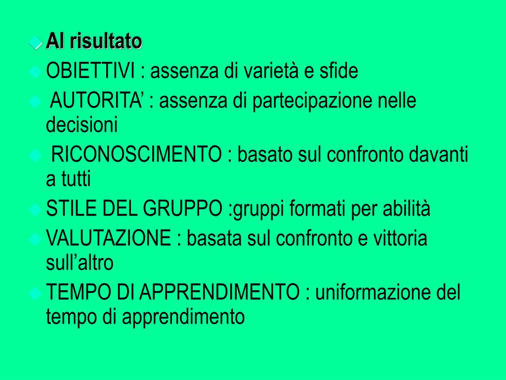 Al risultato • OBIETTIVI : assenza di varietà e sfide • AUTORITA’ : assenza di partecipazione nelle decisioni • RICONOSCIMENTO : basato sul confronto davanti a tutti • STILE DEL GRUPPO :gruppi formati per abilità • VALUTAZIONE : basata sul confronto e vittoria sull’altro • TEMPO DI APPRENDIMENTO : uniformazione del tempo di apprendimento
