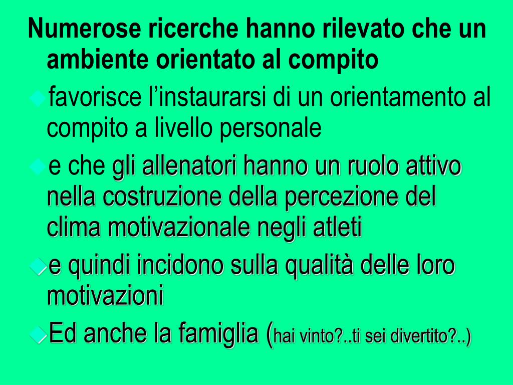 Numerose ricerche hanno rilevato che un ambiente orientato al compito • favorisce l’instaurarsi di un orientamento al compito a livello personale • e che gli allenatori hanno un ruolo attivo nella costruzione della percezione del clima motivazionale negli atleti • e quindi incidono sulla qualità delle loro motivazioni • Ed anche la famiglia (hai vinto?..ti sei divertito?..)