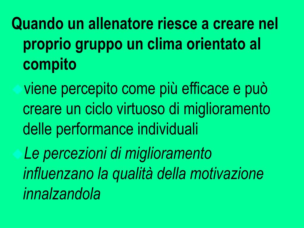 Quando un allenatore riesce a creare nel proprio gruppo un clima orientato al compito • viene percepito come più efficace e può creare un ciclo virtuoso di miglioramento delle performance individuali • Le percezioni di miglioramento influenzano la qualità della motivazione innalzandola