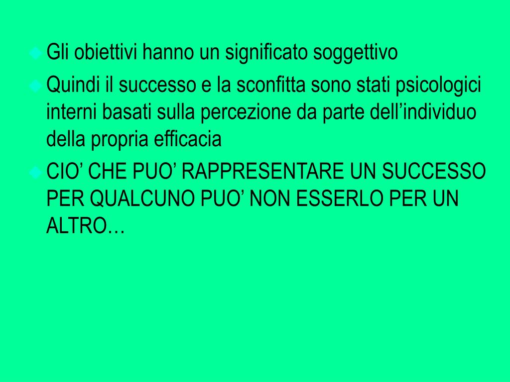 Gli obiettivi hanno un significato soggettivo • Quindi il successo e la sconfitta sono stati psicologici interni basati sulla percezione da parte dell’individuo della propria efficacia • CIO’ CHE PUO’ RAPPRESENTARE UN SUCCESSO PER QUALCUNO PUO’ NON ESSERLO PER UN ALTRO…