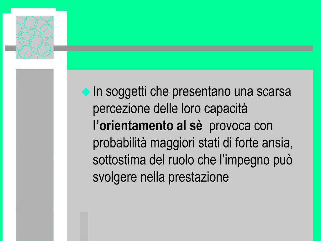 In soggetti che presentano una scarsa percezione delle loro capacità l’orientamento al sè provoca con probabilità maggiori stati di forte ansia, sottostima del ruolo che l’impegno può svolgere nella prestazione