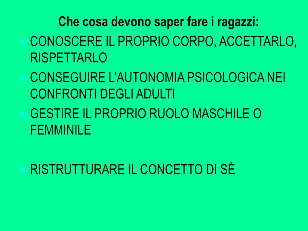 Che cosa devono saper fare i ragazzi: • CONOSCERE IL PROPRIO CORPO, ACCETTARLO, RISPETTARLO • CONSEGUIRE L’AUTONOMIA PSICOLOGICA NEI CONFRONTI DEGLI ADULTI • GESTIRE IL PROPRIO RUOLO MASCHILE O FEMMINILE • RISTRUTTURARE IL CONCETTO DI SÈ