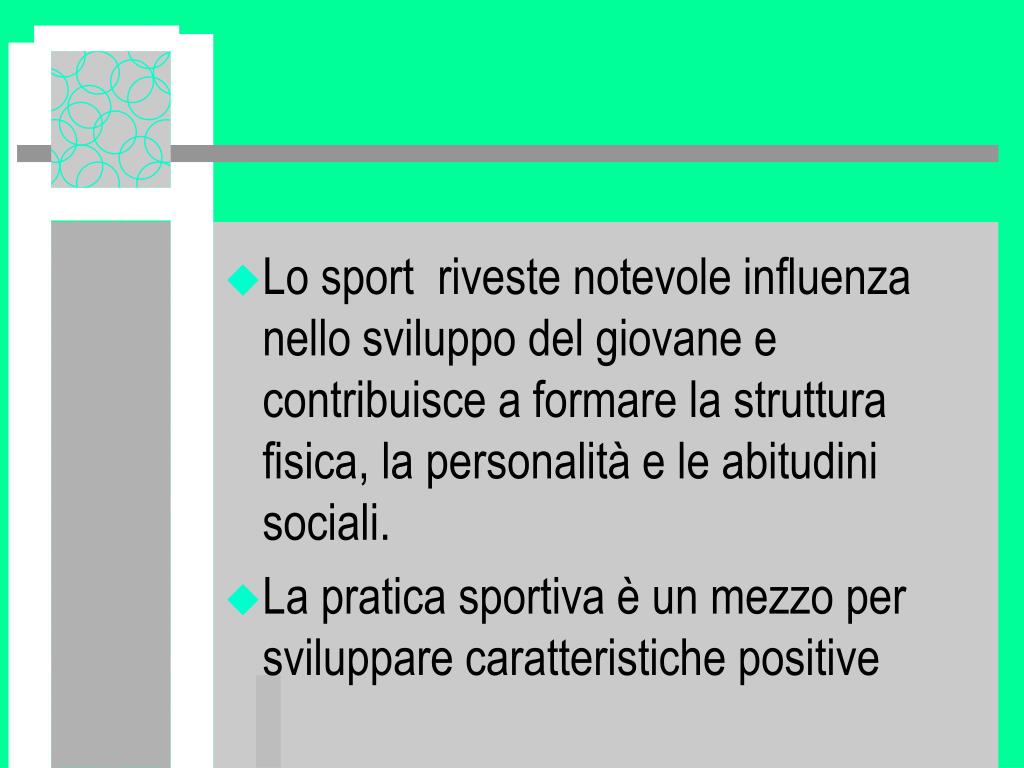 Lo sport riveste notevole influenza nello sviluppo del giovane e contribuisce a formare la struttura fisica, la personalità e le abitudini sociali. • La pratica sportiva è un mezzo per sviluppare caratteristiche positive