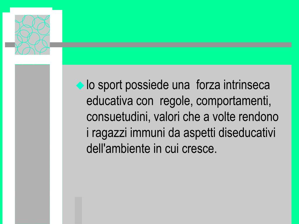 lo sport possiede una forza intrinseca educativa con regole, comportamenti, consuetudini, valori che a volte rendono i ragazzi immuni da aspetti diseducativi dell'ambiente in cui cresce.