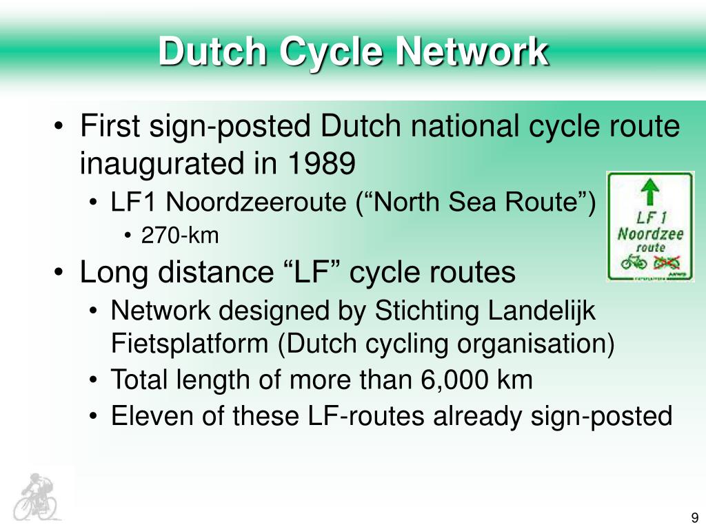 Dutch Cycle Network • First sign-posted Dutch national cycle route inaugurated in 1989 • LF1 Noordzeeroute (“North Sea Route”) • 270-km • Long distance “LF” cycle routes • Network designed by Stichting Landelijk Fietsplatform (Dutch cycling organisation) • Total length of more than 6,000 km • Eleven of these LF-routes already sign-posted