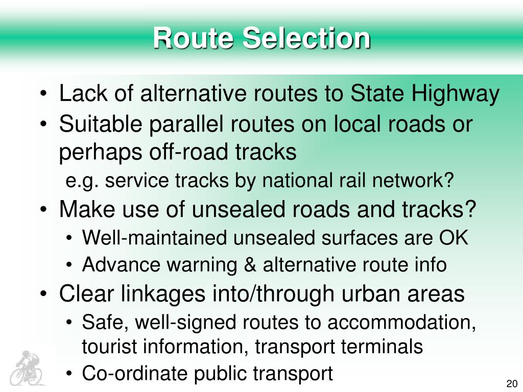 Route Selection • Lack of alternative routes to State Highway • Suitable parallel routes on local roads or perhaps off-road tracks e.g. service tracks by national rail network? • Make use of unsealed roads and tracks? • Well-maintained unsealed surfaces are OK • Advance warning & alternative route info • Clear linkages into/through urban areas • Safe, well-signed routes to accommodation, tourist information, transport terminals • Co-ordinate public transport