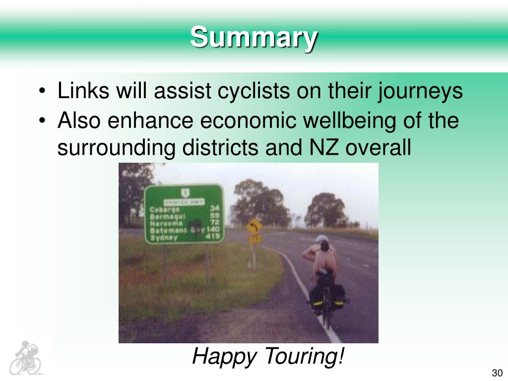 Summary • Links will assist cyclists on their journeys • Also enhance economic wellbeing of the surrounding districts and NZ overall Happy Touring!