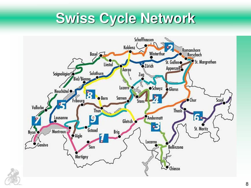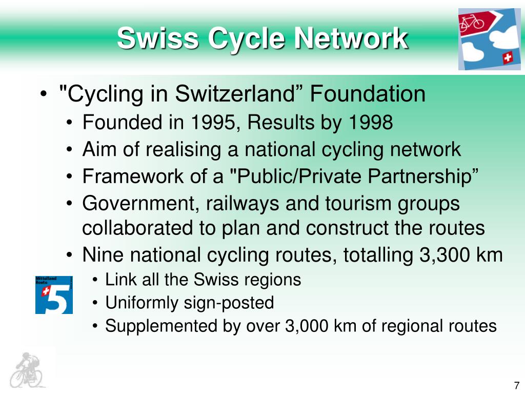 Swiss Cycle Network • "Cycling in Switzerland” Foundation • Founded in 1995, Results by 1998 • Aim of realising a national cycling network • Framework of a "Public/Private Partnership” • Government, railways and tourism groups collaborated to plan and construct the routes • Nine national cycling routes, totalling 3,300 km • Link all the Swiss regions • Uniformly sign-posted • Supplemented by over 3,000 km of regional routes