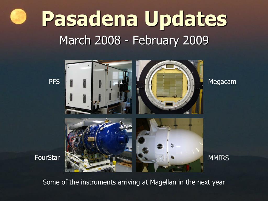 Pasadena Updates PFS Megacam March 2008 - February 2009 FourStar MMIRS Some of the instruments arriving at Magellan in the next year