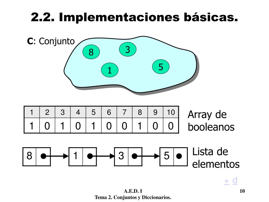 2.2. Implementaciones básicas. C: Conjunto 3 8 5 1 Array de booleanos Lista de elementos + d A.E.D. I 10 Tema 2. Conjuntos y Diccionarios.