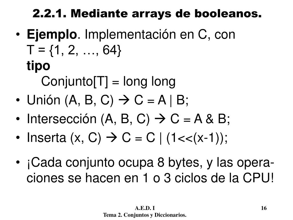2.2.1. Mediante arrays de booleanos. • Ventajas • Operaciones muy sencillas de implementar. • No hace falta usar memoria dinámica. • El tamaño usado es proporcional al tamaño del conjunto universal, independientemente de los elementos que contenga el conjunto. • ¿Ventaja o inconveniente? A.E.D. I 15 Tema 2. Conjuntos y Diccionarios.