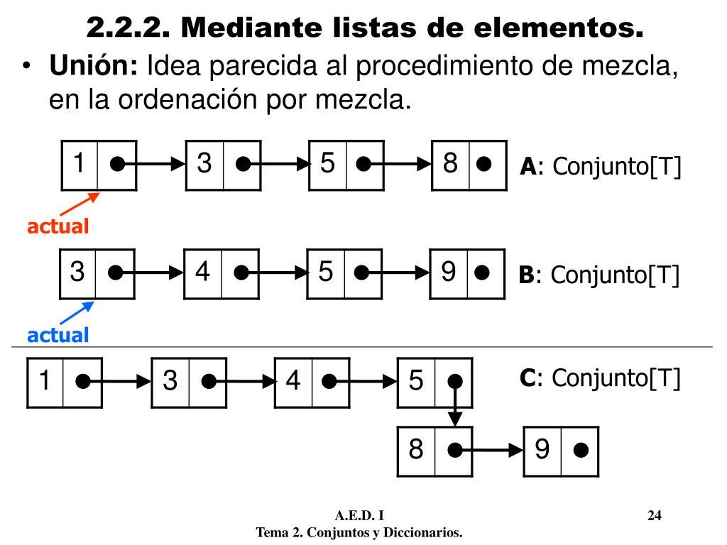 actual actual 2.2.2. Mediante listas de elementos. • Unión: Idea parecida al procedimiento de mezcla, en la ordenación por mezcla. A: Conjunto[T] B: Conjunto[T] C: Conjunto[T] A.E.D. I 24 Tema 2. Conjuntos y Diccionarios.