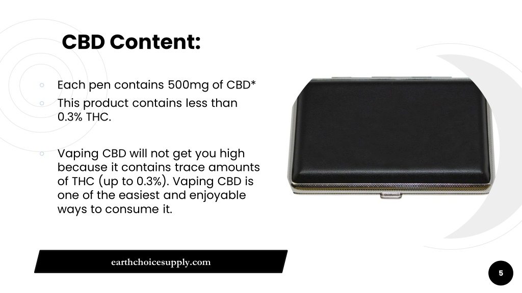 Benefits of Vaping CBD: Relaxation Comfort Pain relief Less anxiety Improved mood Sleepiness (in high doses) Alertness (in low doses) ○ ○ ○ ○ ○ ○ ○ earthchoicesupply.com 4