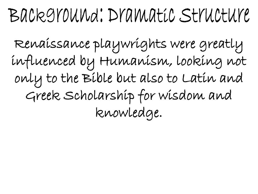 Background: Dramatic Structure Renaissance playwrights were greatly influenced by Humanism, looking not only to the Bible but also to Latin and Greek Scholarship for wisdom and knowledge.