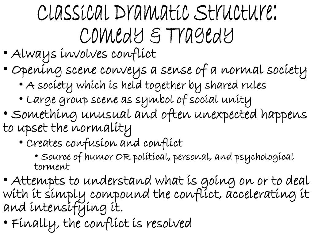 Classical Dramatic Structure: Comedy & Tragedy Always involves conflict Opening scene conveys a sense of a normal society A society which is held together by shared rules Large group scene as symbol of social unity Something unusual and often unexpected happens to upset the normality Creates confusion and conflict Source of humor OR political, personal, and psychological torment Attempts to understand what is going on or to deal with it simply compound the conflict, accelerating it and intensifying it. Finally, the conflict is resolved