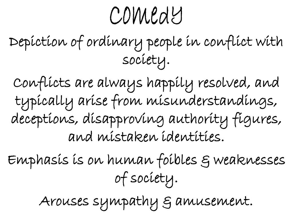 Comedy Depiction of ordinary people in conflict with society. Conflicts are always happily resolved, and typically arise from misunderstandings, deceptions, disapproving authority figures, and mistaken identities. Emphasis is on human foibles & weaknesses of society. Arouses sympathy & amusement.