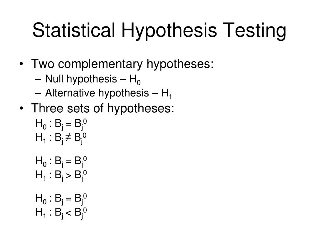 Statistical Hypothesis Testing • Two complementary hypotheses: • Null hypothesis – H0 • Alternative hypothesis – H1 • Three sets of hypotheses: H0 : Bj = Bj0 H1 : Bj ≠ Bj0 H0 : Bj = Bj0 H1 : Bj > Bj0 H0 : Bj = Bj0 H1 : Bj < Bj0