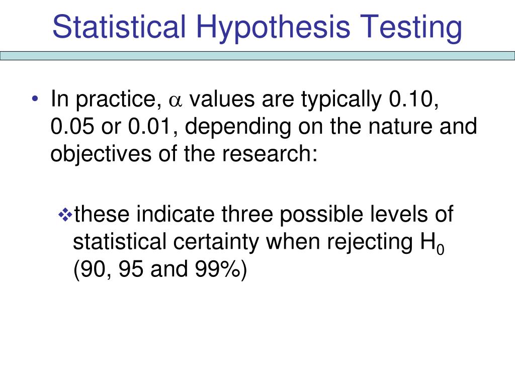 Statistical Hypothesis Testing • In practice, values are typically 0.10, 0.05 or 0.01, depending on the nature and objectives of the research: • these indicate three possible levels of statistical certainty when rejecting H0 (90, 95 and 99%)