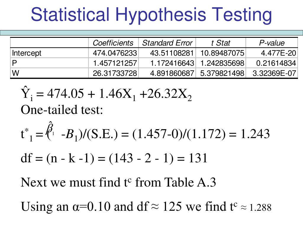 Statistical Hypothesis Testing Ŷi = 474.05 + 1.46X1 +26.32X2One-tailed test: t*1 = ( -B1)/(S.E.) = (1.457-0)/(1.172) = 1.243 df = (n - k -1) = (143 - 2 - 1) = 131 Next we must find tc from Table A.3 Using an α=0.10 and df ≈ 125 we find tc≈ 1.288